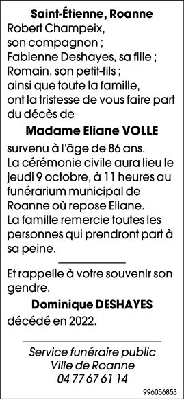 Décédée à Firminy (42700, France) le vendredi 3 octobre 2025 à l'âge de 86 ans