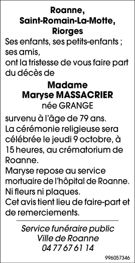 Décédée à Roanne (42300, France) le lundi 6 octobre 2025 à l'âge de 79 ans