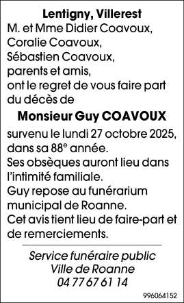 Décédé à Lentigny (42155, France) le lundi 27 octobre 2025 à l'âge de 87 ans
