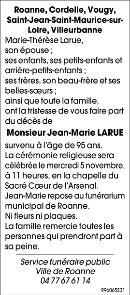 Décédé à Roanne (42300, France) le jeudi 30 octobre 2025 à l'âge de 95 ans
