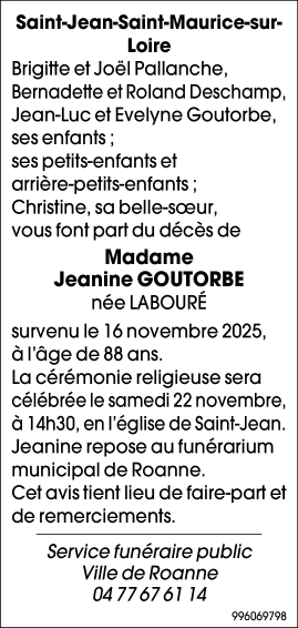 Décédée à Roanne (42300, France) le dimanche 16 novembre 2025 à l'âge de 88 ans