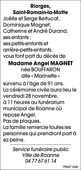 Décédée à Roanne (42300, France) le samedi 22 novembre 2025 à l'âge de 91 ans