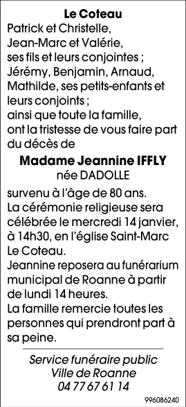 Décédée à Coutouvre (42460, France) le jeudi 8 janvier 2026 à l'âge de 80 ans