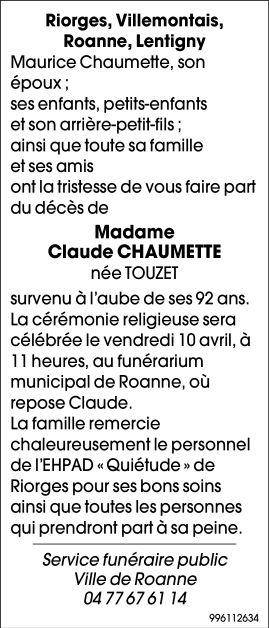 Décédée à Riorges (42153, France) le lundi 6 avril 2026 à l'âge de 91 ans