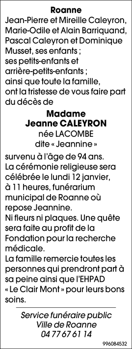Décédée à Roanne (42300, France) le vendredi 2 janvier 2026 à l'âge de 94 ans