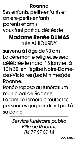Décédée à Mably (42300, France) le lundi 5 janvier 2026 à l'âge de 93 ans