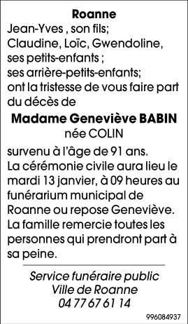 Décédée à Roanne (42300, France) le mardi 6 janvier 2026 à l'âge de 91 ans