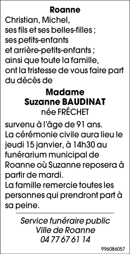Décédée à Roanne (42300, France) le vendredi 9 janvier 2026 à l'âge de 91 ans