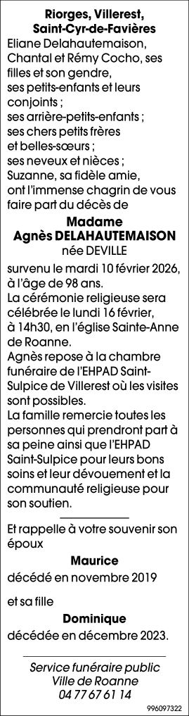 Décédée à Villerest (42300, France) le mardi 10 février 2026 à l'âge de 98 ans