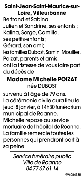 Décédée à Roanne (42300, France) le dimanche 4 janvier 2026 à l'âge de 79 ans