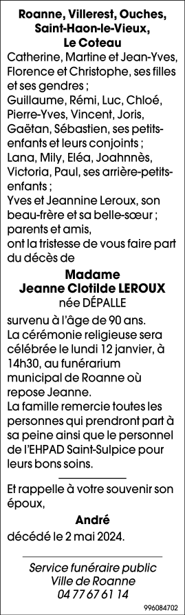 Décédée à Villerest (42300, France) le lundi 5 janvier 2026 à l'âge de 90 ans