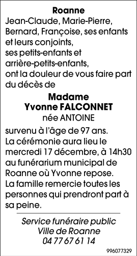 Décédée à Roanne (42300, France) le jeudi 11 décembre 2025 à l'âge de 97 ans